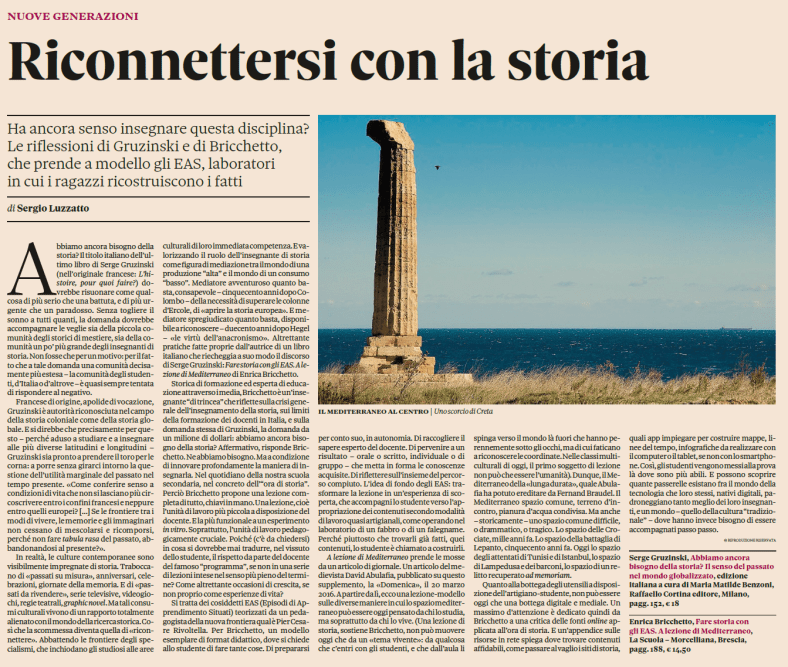 La recensione di Luzzatto risulta in verità piuttosto scarna, relativa, sembrerebbe, più a questioni tutte italiane, ma forse così concepita per limiti di spazio, risultando pubblicata insieme a quella di un altro testo, di Enrica Brichetto, Fare storia con gli EAS. A lezione di Mediterraneo, La Scuola-Morcelliana, Brescia, 2016.